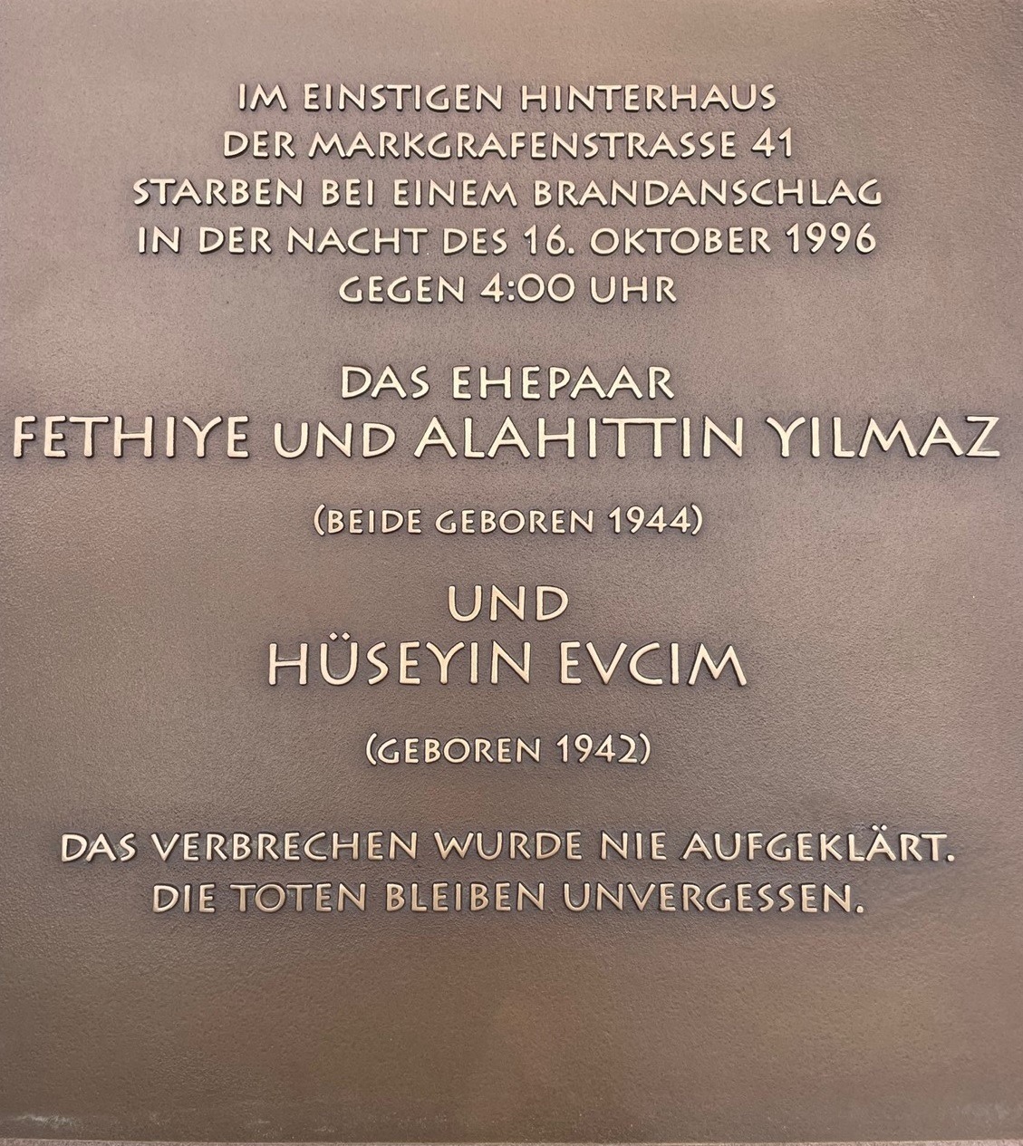 An dieser Stelle werden Passant*innen nun dazu aufgefordert, kurz innezuhalten und die Namen der Opfer zu lesen. Namen, die noch immer schwer über unsere Lippen kommen ‒ obwohl sie schon lange ein Teil unserer Gesellschaft sind. Die Namen derer, an die wir hier gedenken, lauten: Fethiye Yilmaz, Alahittin Yilmaz und Hüseyin Evcim. Als Fraktion GRÜNE haben wir die Verwaltungsvorlage für die Stele gern unterstützt.