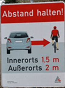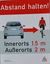 Das von der Stadtverwaltung selbst erdachte Schild zu den einzuhaltenden Überholabständen zwischen Rad und KFZ wird an weiteren relevanten Stellen (insbesondere an Strecken außerorts) aufgestellt.