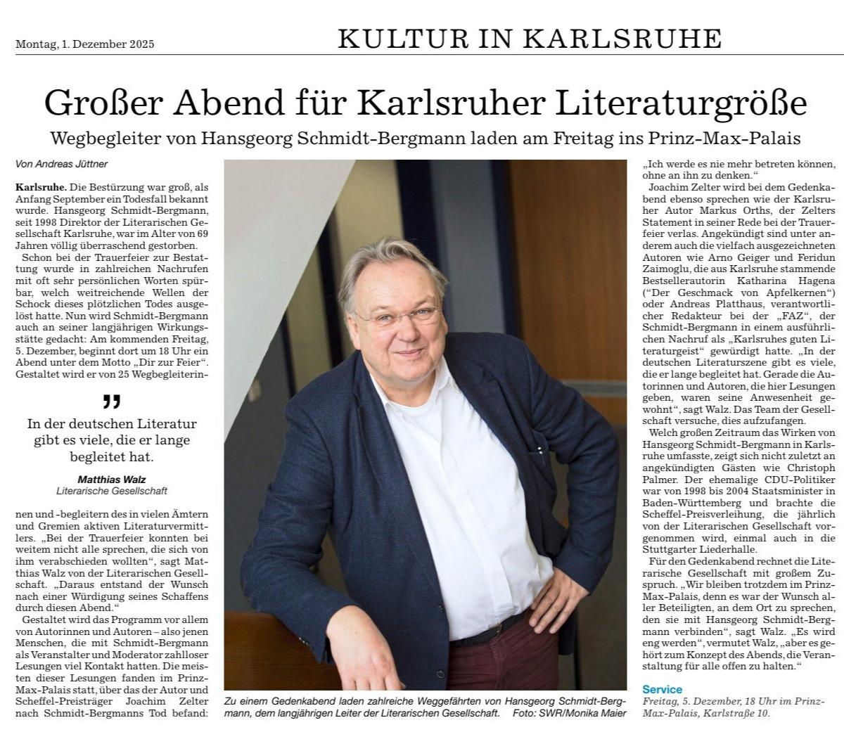 Freitag, 5.12.25 / 18 Uhr / PrinzMaxPalais „Dir zur Feier“. Ein Abend im Gedenken an Prof. Dr. Hansgeorg Schmidt-Bergmann (19.2.1956 - 3.9.2025)