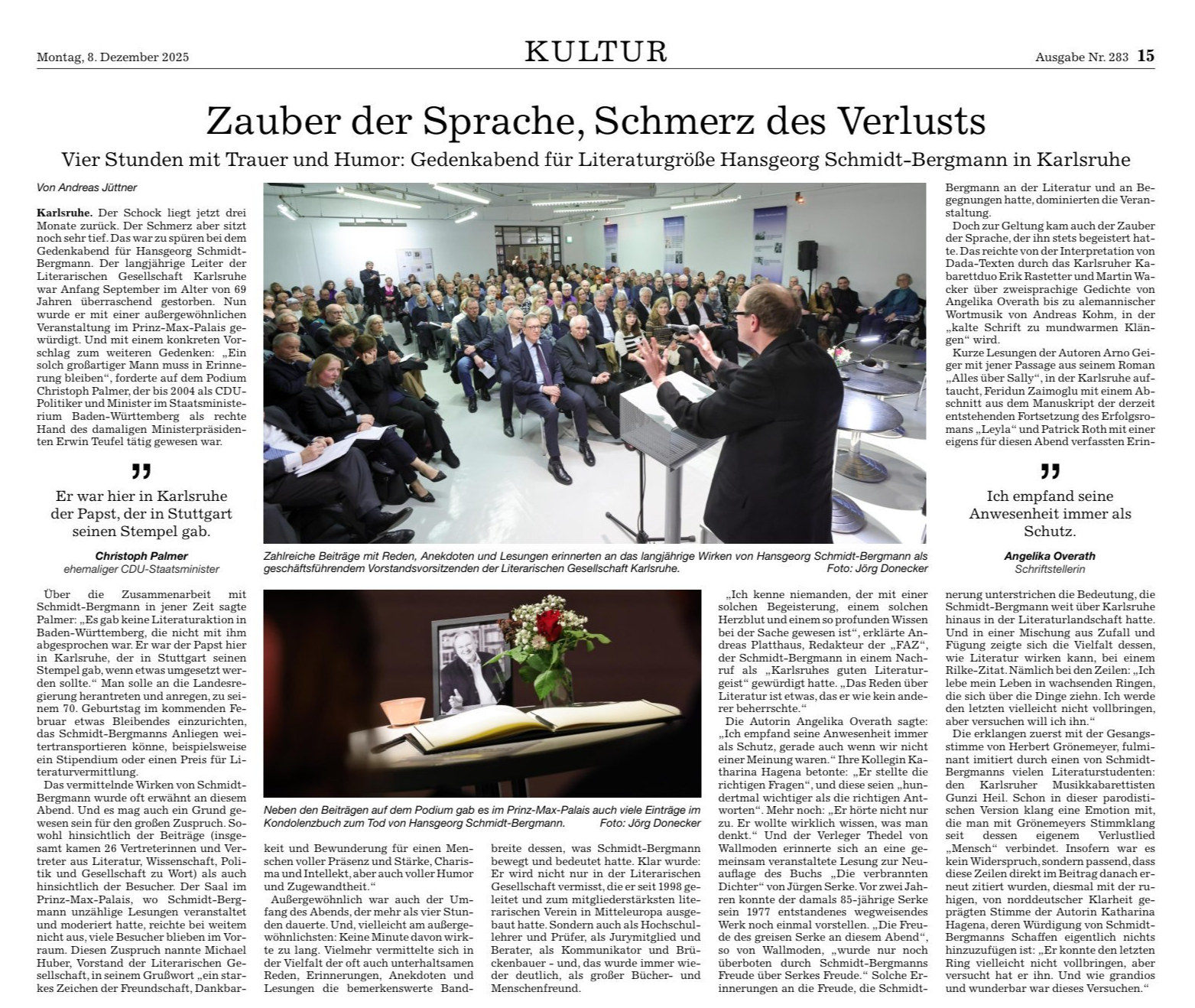 Mit Wegbegleiterinnen und Wegbegleitern wie Arno Geiger, Günter Berg, Dr. Katharina Hagena, Gunzi Heil, Prof. Dr. Mathias Herweg, Prof. Dr. Jan Knopf, Katharina Oberkalkofen, Markus Orths, Karl-Heinz Ott, Angelika Overath, Dr. Christoph Palmer, Birgit Pfitzenmaier, Andreas Platthaus, Roman Pliske, Erik Rastetter, Dr. Claudia Rose, Martin Wacker, Prof. Thedel von Wallmoden, Prof. Dr. Matthias Wiegandt, Feridun Zaimoglu und Joachim Zelter.Impressionen aus dem Leben eines rastlosen Förderers der Gegenwartsliteratur, einer intellektuellen Instanz: In tiefer Trauer gedenken wir Prof. Dr. Hansgeorg Schmidt-Bergmann, unserem Chef