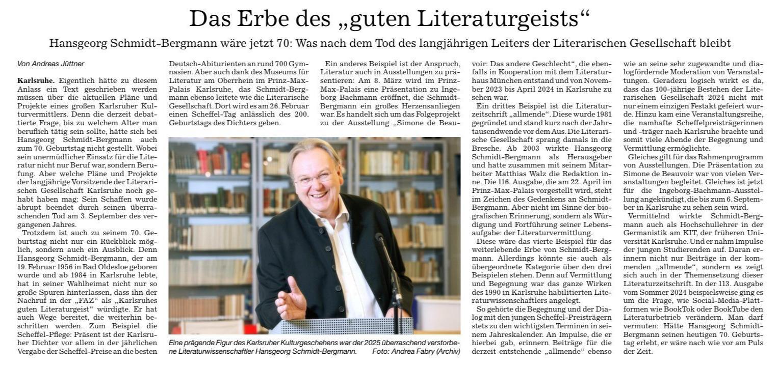Der geschäftsführende Vorsitzende der Literarischen Gesellschaft Karlsruhe, unser Chef, Prof. Dr. Hansgeorg Schmidt-Bergmann, ist am Mittwoch, den 3. September, plötzlich und unerwartet gestorben. Wir sind tief getroffen und bestürzt.